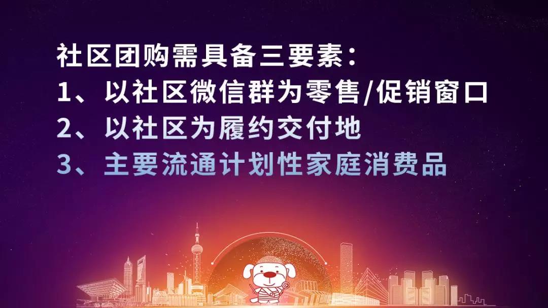 訂單兔連總為我們講述到社區團購是以微信為主要零售渠道,以落地配為主要物流方式,以家庭消費類的計劃性商品為主流的一種購物場景。不難看出,社區團購需具備三要素,即: