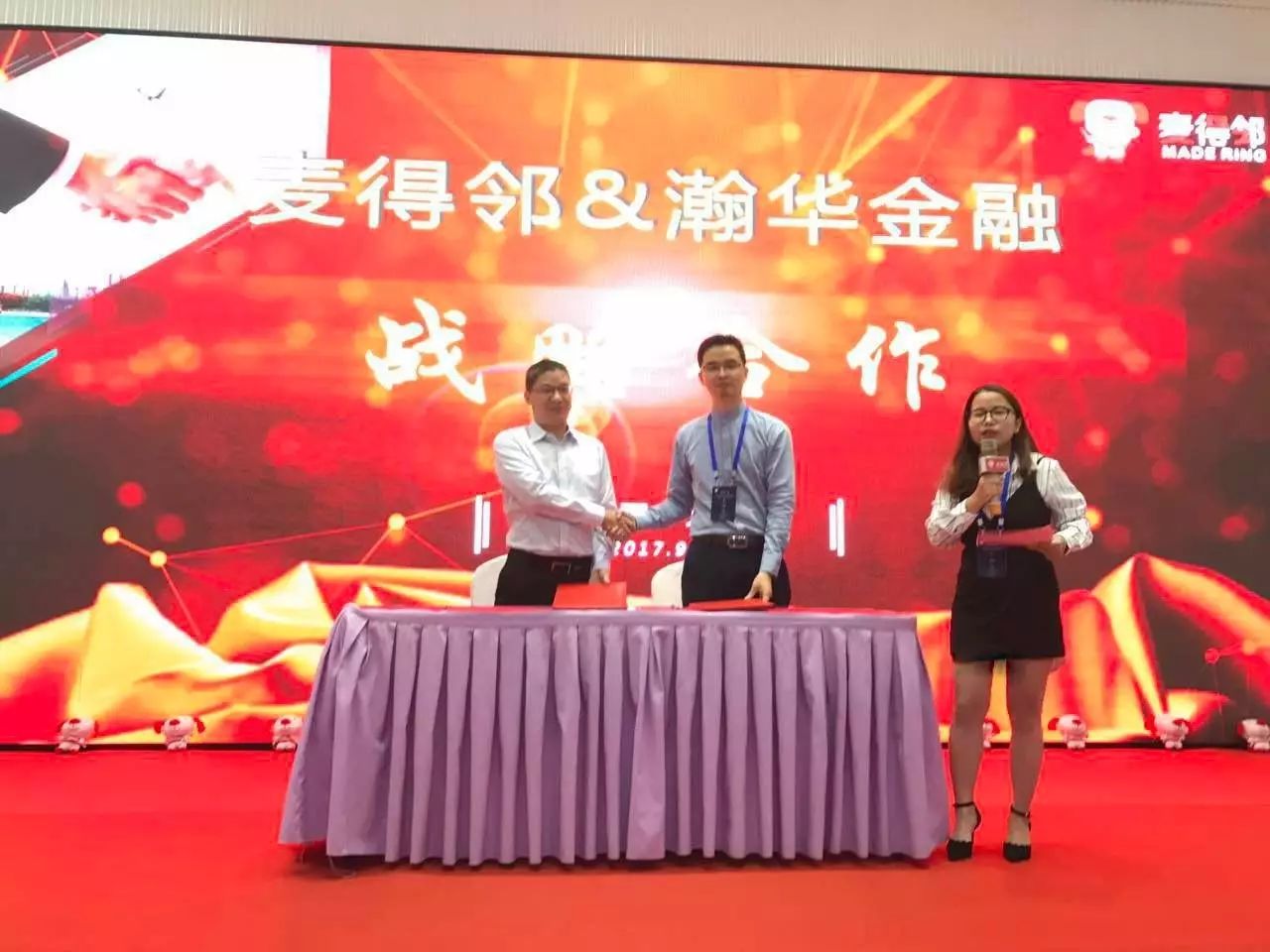 如果說徐總的關于轉型話題吸引了學員的話,那我覺得,接下來的一幕,更是讓大家關注,麥得鄰與瀚華金融的簽約。原來經銷商缺錢,靠銀行貸款抵押,現在經銷商缺錢,靠經營數據貸款,無須抵押,無須擔保。瀚華與麥得鄰的簽約結盟,也算麥得鄰為信任我們的學員們提供的一大福利。