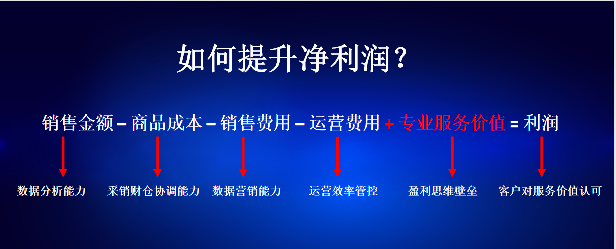 麥得鄰COO張總以“如何提升凈利潤”引出話題。利潤=銷售金額-商品成本-銷售費用-運營成本+專業服務價值。銷售金額考驗員工的數據分析能力,商品成本考驗員工采銷財倉協調能力,銷售費用考驗員工數據營銷能力,運營費用則依賴運營效率感控,扣除所有后,最后剩下的才是利潤。簡而言之凈利潤離不開商品、團隊、和客戶。提升凈利潤的核心在于利用精準營銷提升有質量的銷售。