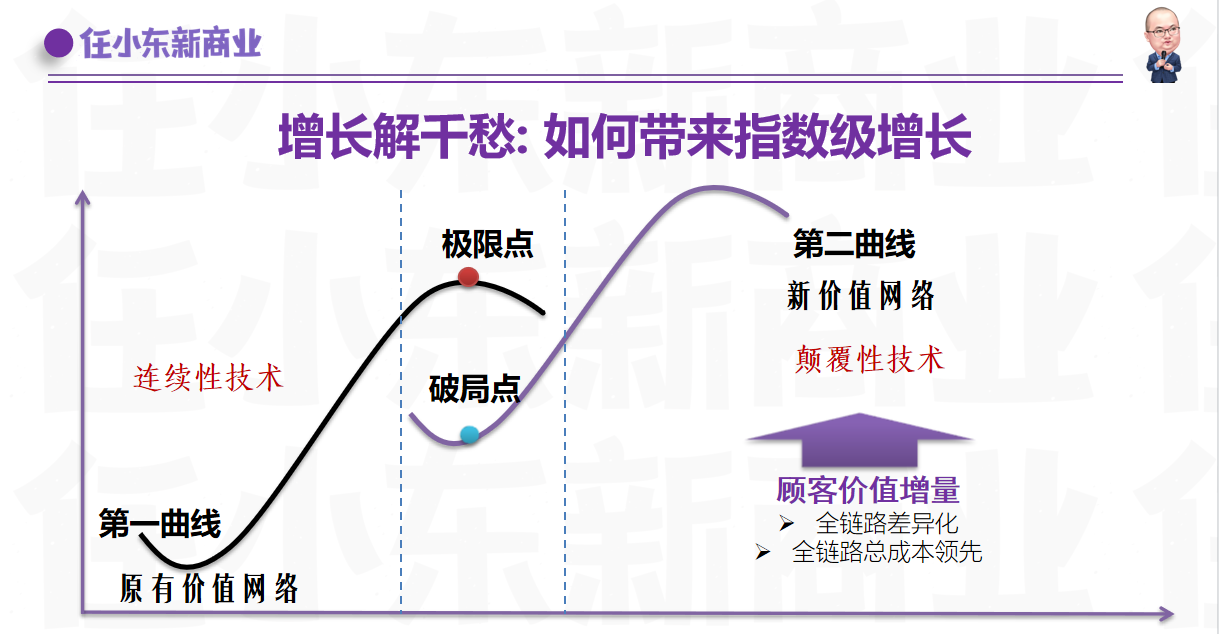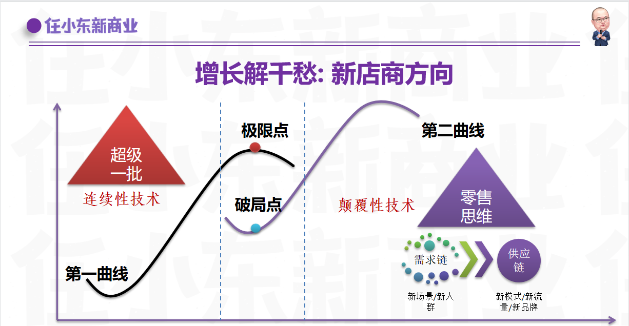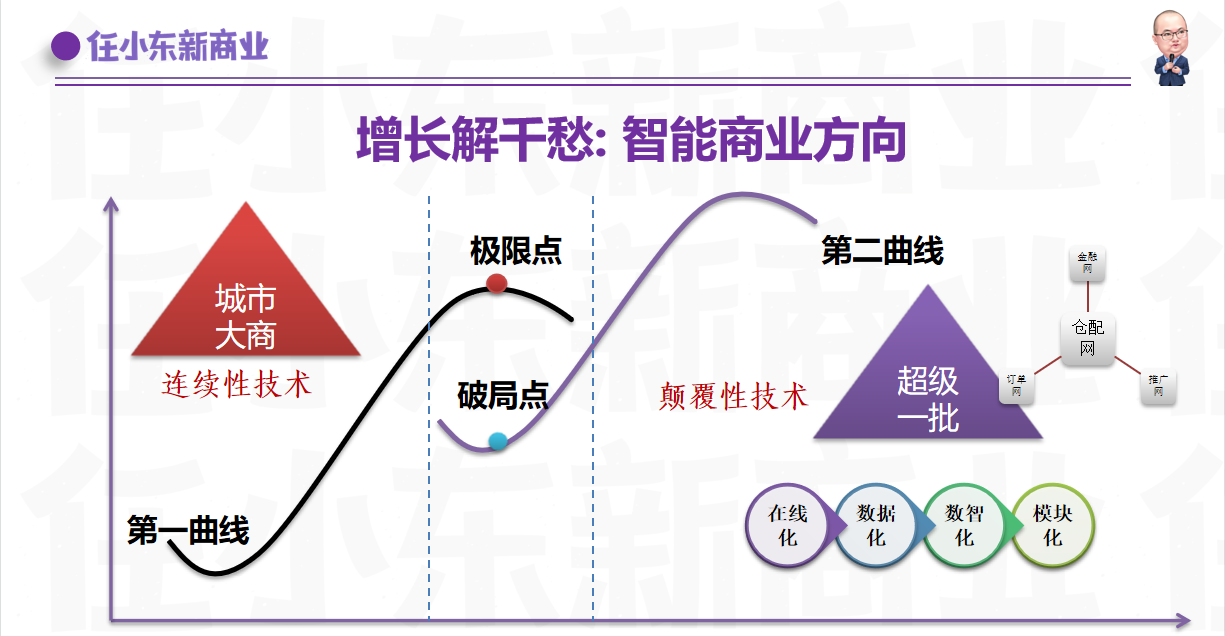 作為新商業創始人兼研究者,任小東老師在新商業上頗有見解。任小東老師通過兩條曲線形式,分享了如何帶來指數級增長、智能商業方向、新電商方向。